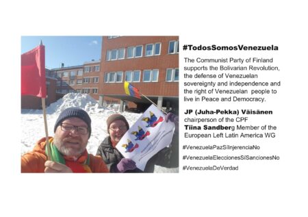 <p>Suomen kommunistisen puolueen puheenjohtaja JP (Juha-Pekka) Väisänen ja Euroopan vasemmiston Latinalaisen Amerikan ryhmän jäsen Tiina Sandberg osallistuvat viikonlopun kansa