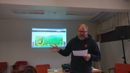 <p>SKP:n puheenjohtaja JP (Juha-Pekka) Väisänen kuvaa kesäkokouksen puheessaan erilaisia protesteja ja haastaa kommunisteja laittamaan proletaarisen pisteen työläisten riistol