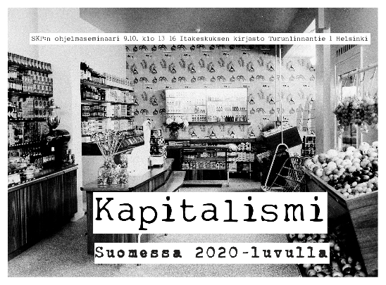 Lauantaina 9.10 klo 13-16 on vuorossa ohjelmaseminaari ja webinaari Kapitalismi Suomessa 2020-luvulla. Keskustelua avaavat talouden ja sosiaalipolitiikan tutkija Pertti Honkanen, ay-liikkeen ja hyvinvointivaltion tutkija Päivi Uljas sekä politiikan tutkija Andreas Fagerholm. Tässä keskustelussa arvioidaan erityisesti tarpeita uudistaa puolueohjelman toista lukua tämän päivän Suomesta. Keskustelu käydään kunkin lyhyen alustuspuheenvuoron jälkeen erikseen sen teemoista.