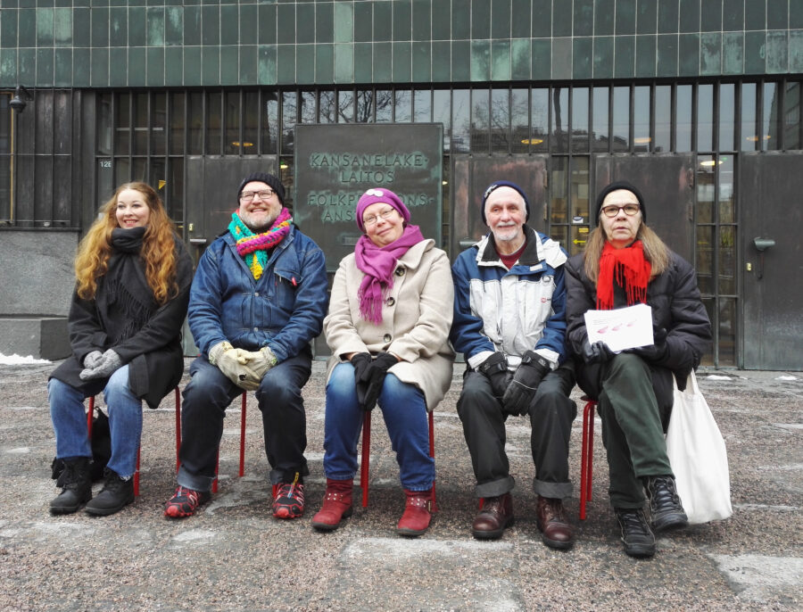 Kelan pääkonttorin edustalla ohikulkijat ihmettelivät torstaina hiljaisia hymyilijöitä. Rivi tuijotti eteensä teennäiset virneet kasvoillaan. SKP:n puheenjohtaja JP Väisänen osallistui Kelan pääkonttorin edustalla Katastrofin vastainen hymyily -tempaukseen, jolla otetaan kantaa Kela-kaaokseen.