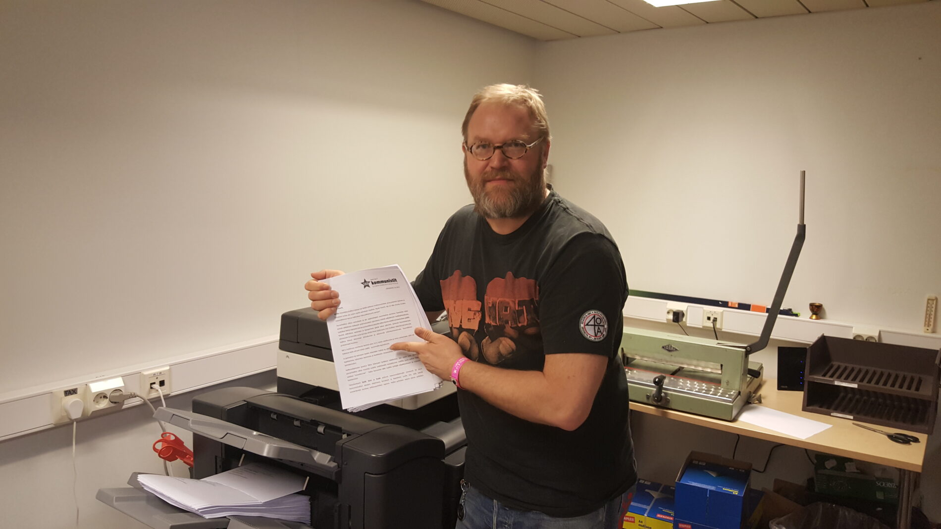 SKP:n puheenjohtaja JP (Juha-Pekka) Väisänen on juuri saanut valmiiksi perinteisen jäsenkirjeen. Puoluetoimiston kopiokone käy kuumana. Helsingin ja Uudenmaan piirin aktiivit auttavat postituksessa. Kaikille jäsenille lähetetään myös uusi kuvataiteilija Jani Leinosen suunnittelema SKP-pinssi.