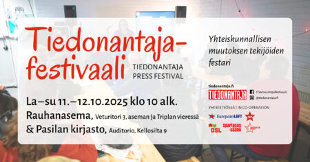 Festival of social change, activism, and cooperation, Tiedonantaja Press Festival, will take place at the Peace Station (Rauhanasema) in Pasila, Helsinki, on Saturday and Sunday, O