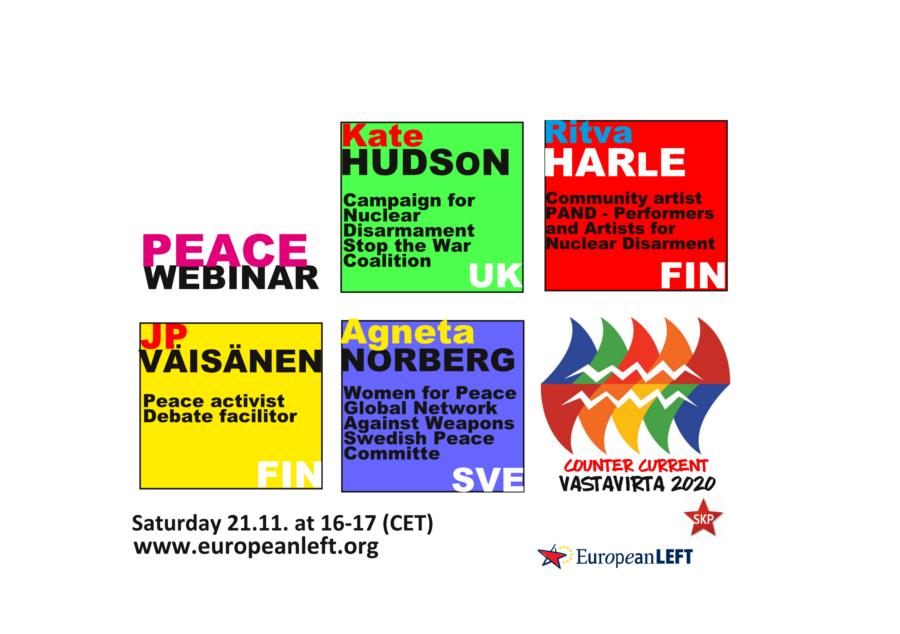 Eurooppalaisista rauhanaloitteista, aseidenriisunnasta ja kansalaisyhteiskunnan rauhanrakentamisen tulevaisuuden askelista keskustelevat englanninkielisessä verkkoseminaarissa 21.11. Kello 17-19 (Suomen aikaan) kolme aktivistia Suomesta, Ruotsista ja Englannista.