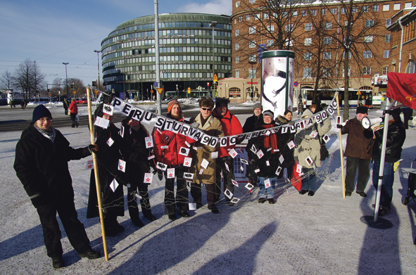SKP julkisti tänään Hakaniemen torilla aloitteen perusturvan uudistamiseksi. SKP toi torille verkkoja paikattavaksi ja uusittavaksi esimerkkinä perusturvan parantamisen tarpeesta. SKP syytää hallituksia ja eduskuntaa siitä, että jo noin 700 000 suomalaista joutuu sinnittelemään EU:n määrittelemän köyhyysrajan alapuolella.