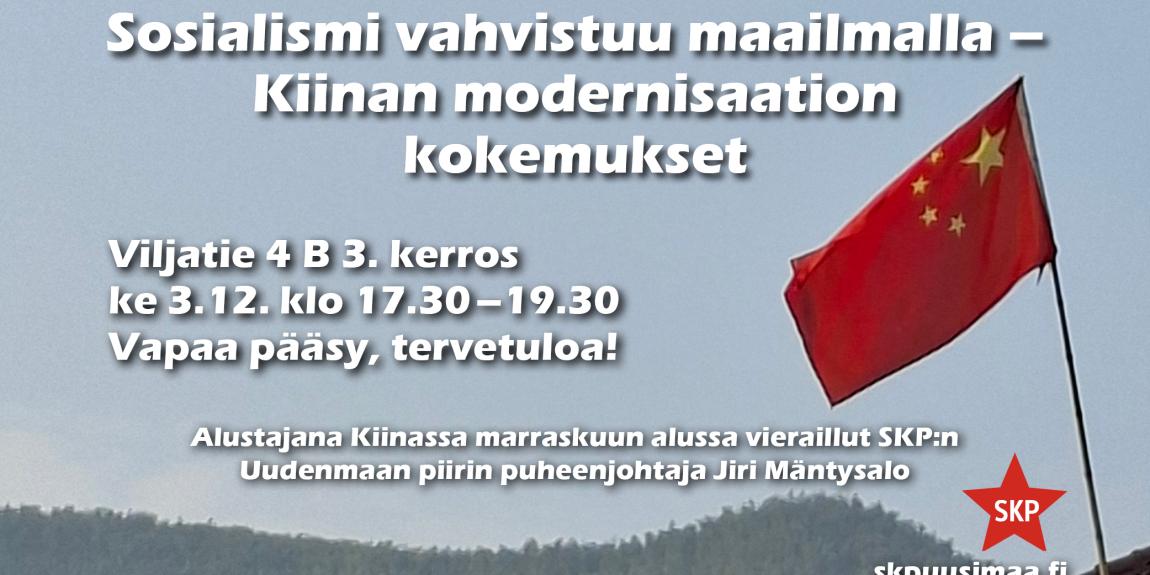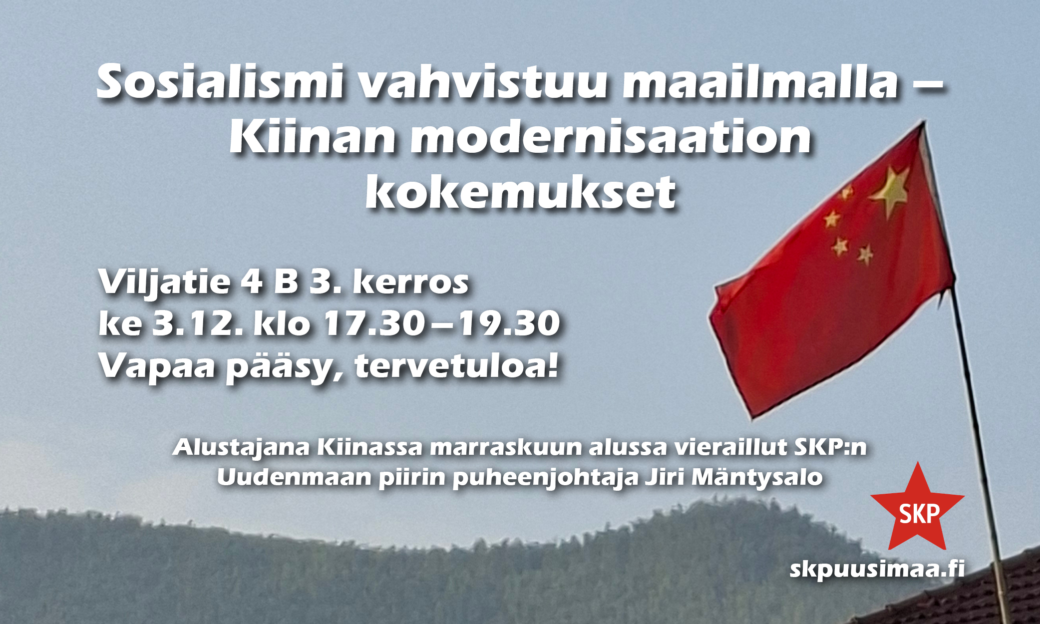 Tilaisuudessa SKP:n Uudenmaan piirin puheenjohtaja Jiri Mäntysalo kertoo kokemuksiaan ja havaintojaan Maailman Sosialismifoorumista Pekingistä sekä maakuntamatkalta Kiinan Zhejiangin maakuntaan 2.–10.11.