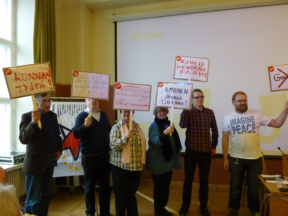 Euroopan vasemmiston hallituksen jäsen Jean-Francois Gau toi Vaihtoehtoiseen kuntafoorumiin terveisiä leikkauspolitiikkaa vastustavista eurooppalaisista joukkoliikkeistä.