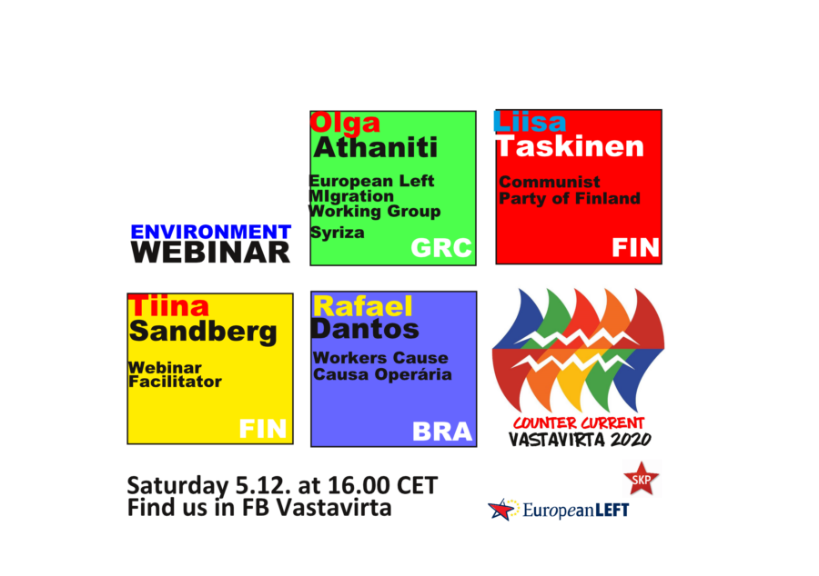 Speakers at the English – language webinar will be Liisa Taskinen, Vice – President of the Communist Party of Finland, Olga Athaniti, actress and radio producer, leader of the European Left Migration Working Group and member of the Greek left – wing party Syriza and Rafael Dantos member of the Brazilian Causa Operária working class party. The facilitator of the event is Tiina Sandberg Secretary General of the Communist Party of Finland.